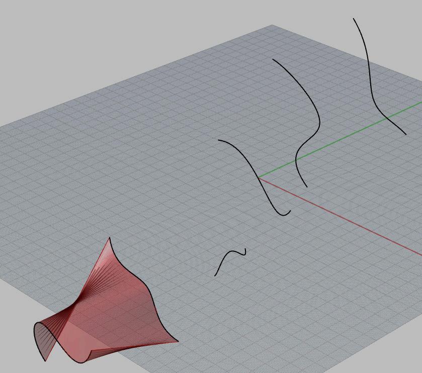 Various Rhino commands were used for surface generation. The most successful were the ones that created the most double curvature while staying true to the edge curves, such as NetworkSrf.