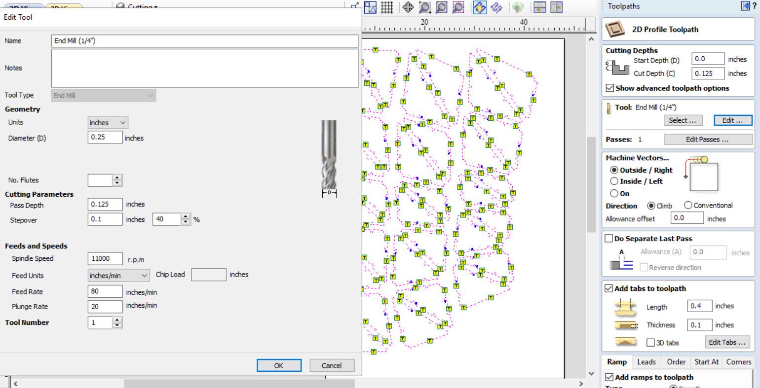 Nested Rhino drawings were programmed to be cut by V-carve. Different bits require different toolpaths.