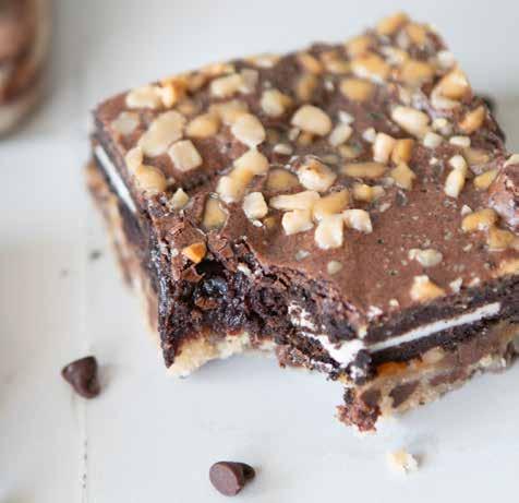 To prepare the brownie batter, whisk together melted butter, sugar, and brown sugar in a large bowl. Add eggs and vanilla extract, then mix in flour, cocoa powder, baking powder and salt. Spread batter over Oreos and top with remaining 1/2 cup Heath bits.