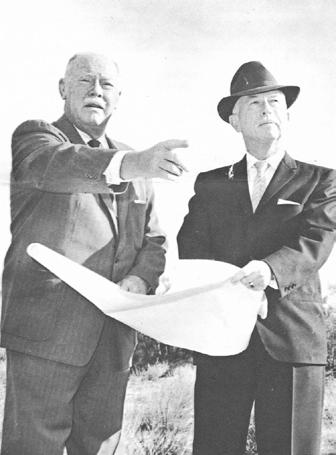 Tom Darlington, left, and K.T. Palmer, right, the visionary founders of Carefree, stand together in the early days of the town's development. Their dream of creating a desert oasis blending natural beauty with thoughtful planning laid the foundation for the unique community Carefree has become over the past 40 years.