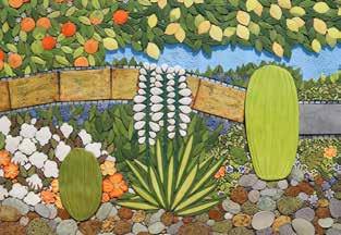 “The Desert’s Garden” portrays olive and desert ironwood trees, pima cotton, bougainvillea, citrus trees, poppies, violets, oleander and yucca as well as the monarch butterfly, black cardinal, Anna’s hummingbird, Gambel’s quail and western bluebird.