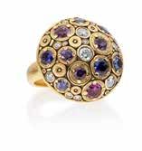 Alex Sepkus Blooming Hill: A garden of color blooms on the finger — purple, blue and violet sapphires create a mesmerizing display within this 18-karat yellow gold dome shield ring. $19,080