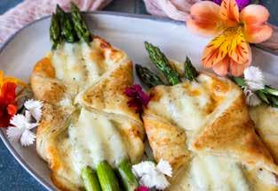 What better way is there to welcome spring than with these delicious asparagus prosciutto wraps? They are stunning to look at and highlight a beautiful spring vegetable — asparagus. They are easy to make but look like you've worked all day on them. I love the combination of white cheddar cheese, prosciutto and asparagus, all wrapped together in puff pastry then glazed with a honey-tinged egg wash. Add some edible flowers to your platter to make it pop!