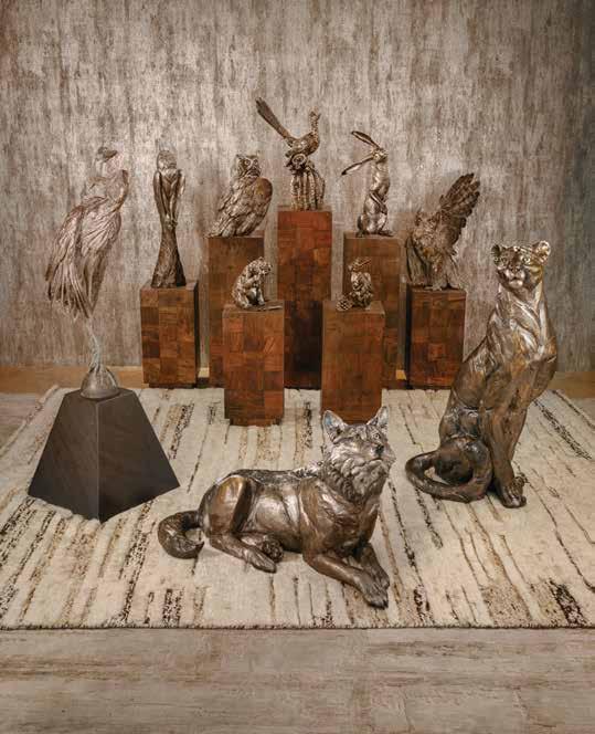 This living space is an intimate study in elevated desert modernism, where organic textures meet curated artistry. Sculptural seating and soft, rounded ottomans invite conversation, while a statement console of branch-like wood grounds the room in natural drama. Hand-selected wildlife paintings by Trevor Swanson and bronze accents by Bryce Pettit add gallery-like sophistication, balancing refinement with warmth. Natural materials and warm tones come together to create an atmosphere that feels both luxurious and effortlessly inviting.