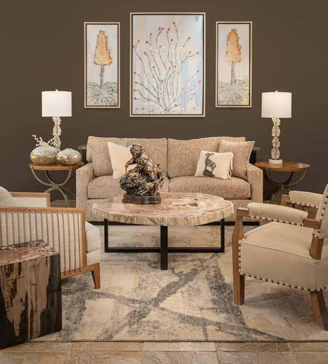 A single stroke of urban bronze transforms this interior into a study in modern elegance. The accent wall, rich and refined, sets the stage for a curated composition: a sculptural petrified wood table, a leather-laced chair with artisanal detailing, and a contemporary rug that anchors the room with quiet sophistication. Elevated by striking artwork from Rene Palomino, the space captures a dialogue between organic texture and contemporary polish — a timeless balance of warmth and bold design.