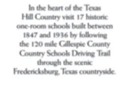 In the heart of the Texas Hill Country visit 17 historic one-room schools built between 1847 and 1936 by following the120 mile Gillespie County Country Schools Driving Trail through the scenic Fredericksburg,Texas countryside. Restor ing and Preserv ing Our History