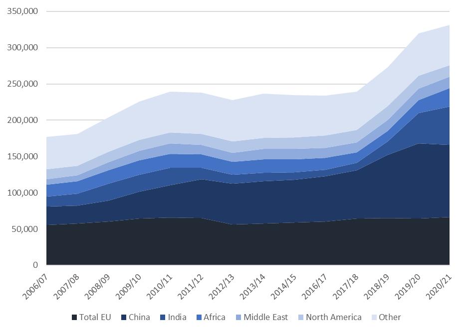 An increasing number of overseas students are choosing to study at UK universities. Whilst the number of students from EU countries is relatively stable, the number of students from China and India, and to a lesser extent the Middle East, has increased significantly in recent years. This partly follows a change to visa and immigration rules, announced in 2018/19 and coming into effect in July 2021, that allows international students two years to find work after graduation, or three years for PhD graduates.20 A memorandum of understanding was signed between the Indian and British governments in July 2022 introducing mutual recognition of academic qualifications. The move is expected to lead to further international student enrolment in UK universities.21