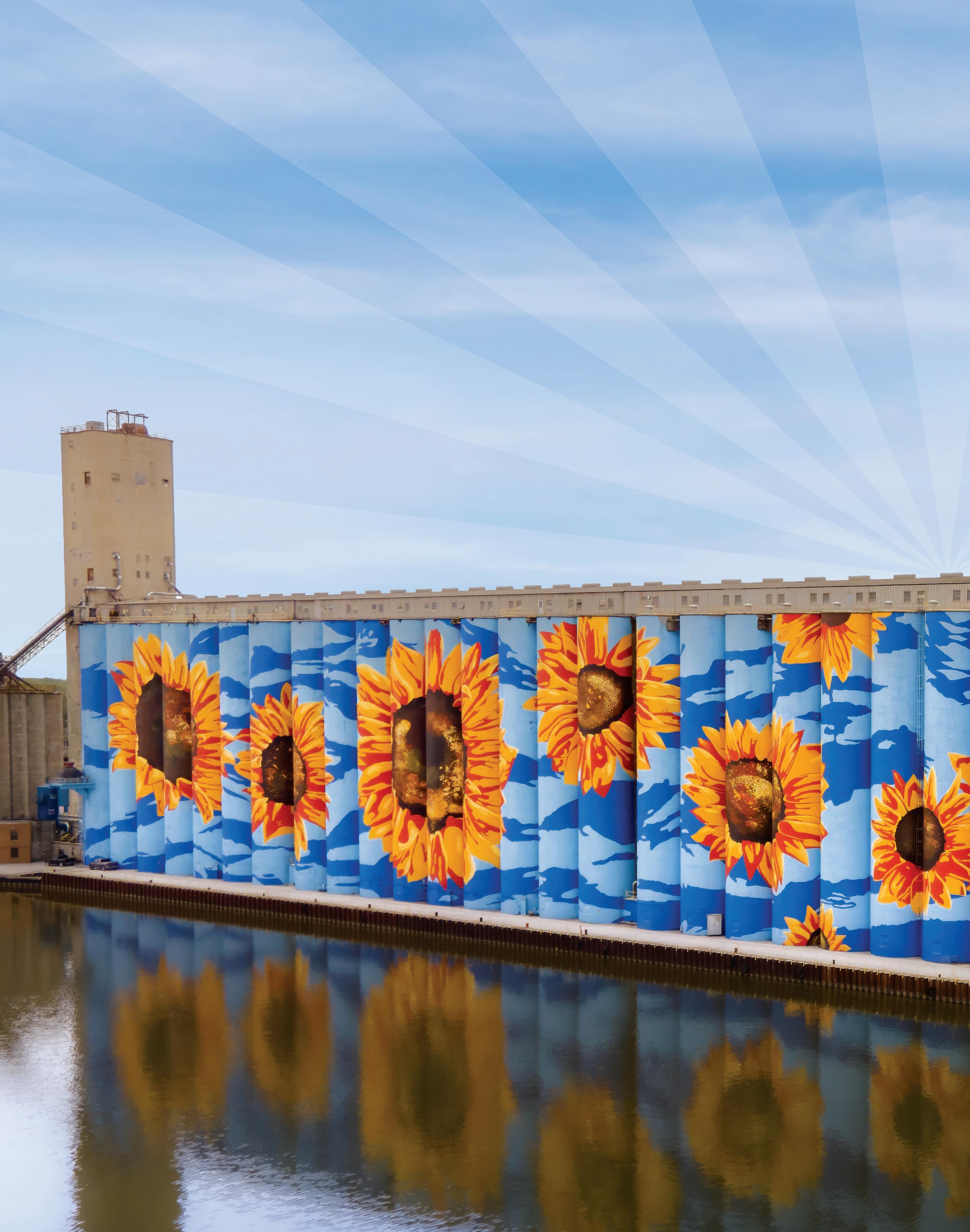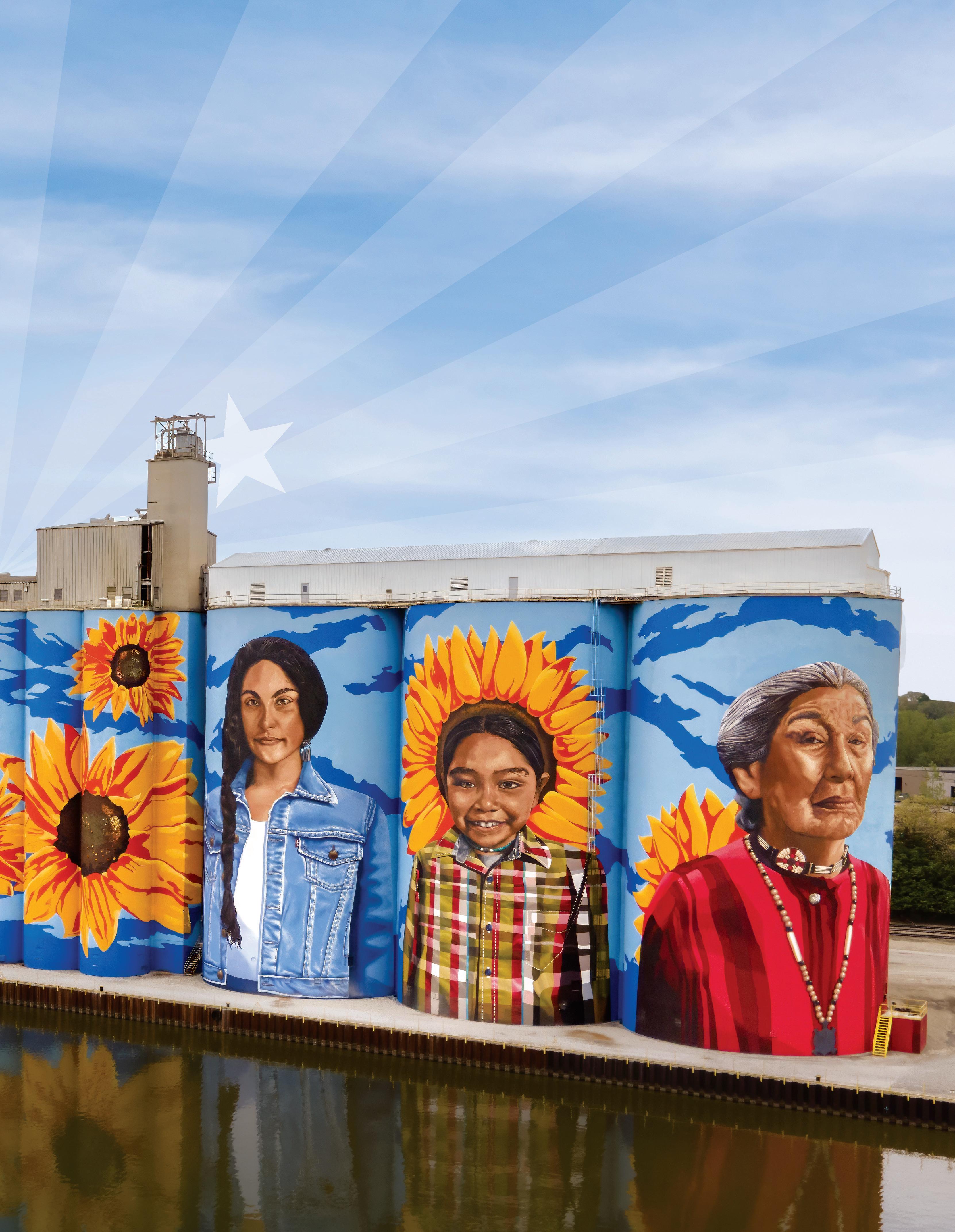 Ohio’s cities find their way onto the map with Grain to Glass, a Cincinnati mural by Jim Effler that portrays each step in the beer-making process and pays homage to the Queen City’s deep ties to the industry. The Glass City River Wall, a massive artwork designed by Gabe Gault, spans 28 silos along the Maumee River in Toledo and honors the area’s Indigenous history.
