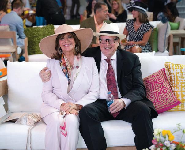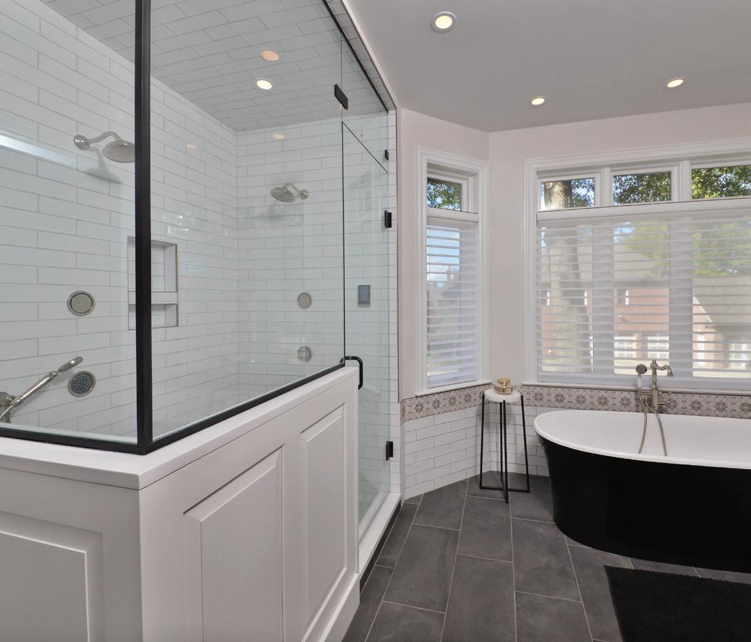 stool consisting of an acrylic frame and seat upholstered in black, a striking neutral used to paint door and window frames and trim the valance in a Greek key pattern. The focal point in a room of focal points is arguably the Victoria + Albert freestanding tub installed between the two entrances from the bedroom. Carter notes it is made of volcanic limestone that is milled and mixed with resins. “It holds heat very well,” he says. “So the water stays warm for a very long time.” The feature, the exterior of which was custom finished in the same