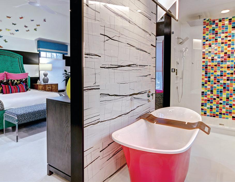 “It was definitely challenging to figure out how to incorporate all these colors without looking like a clown house,” he says, particularly given the clients’ design goals. “They really wanted a luxurious space that reminded them of a hotel. Once they entered the door, it was their own private oasis.”