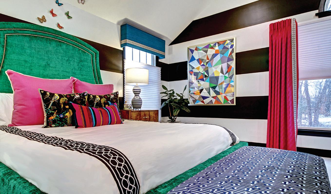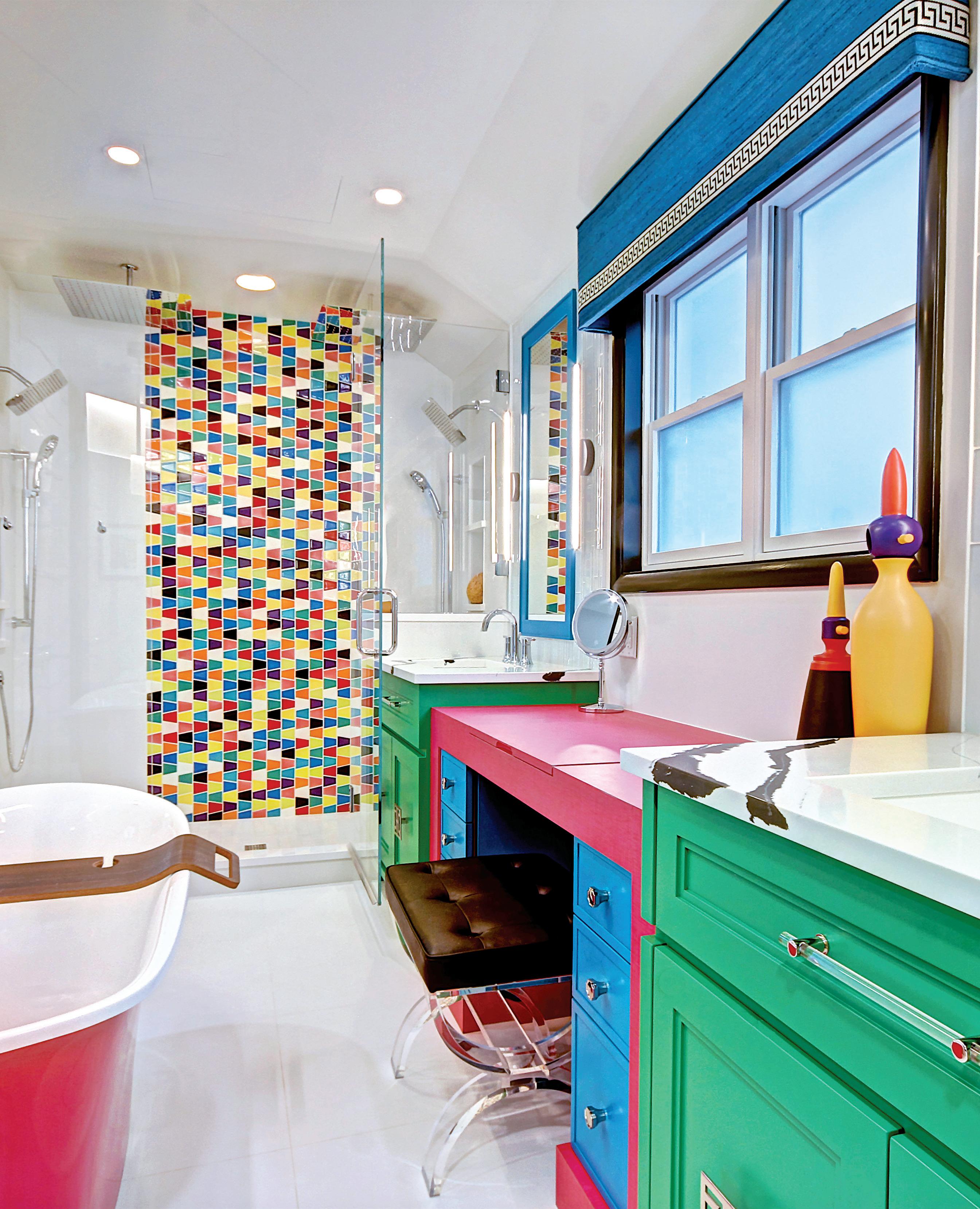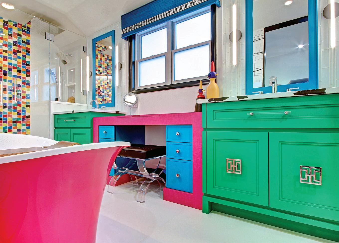 Carter outfitted one long wall with custom his-and-hers vanities separated by a makeup table, an amenity conveniently illuminated by natural light from an overhead window. “[The vanities] just gravitated towards green,” he says of the emerald semi-gloss used to paint them. The makeup table, in contrast, was covered in a fuchsia laminate. It’s more durable for nail-polish remover, beauty products and stuff,” he says. “It holds up better than a stone would. And there’s no such thing as a fuchsia natural stone or quartz.”
