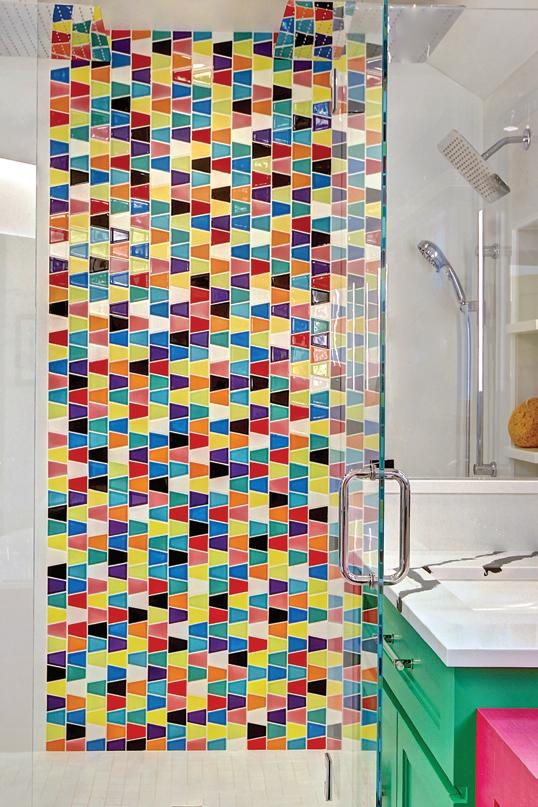 Carter began by creating a pure-asthe-driven-snow backdrop in the bath, where contractors had removed a wall separating it from a walk-in closet — a necessity replaced by a built-in bedroom wardrobe cabinet — to add square footage. He then constructed a water closet for the commode and relocated the entrances from the bedroom to the bath and the former closet to symmetrical locations on one wall. He covered that wall in a white porcelain tile striated in white and gray and finished the floor and two facing walls of the newly created 8-by-4foot shower in a plain white porcelain counterpart. The latter was the perfect foil for a back shower wall tiled in a mosaic of handmade trapezoidal tiles in everything from orange to teal to lime green, some custom colored.