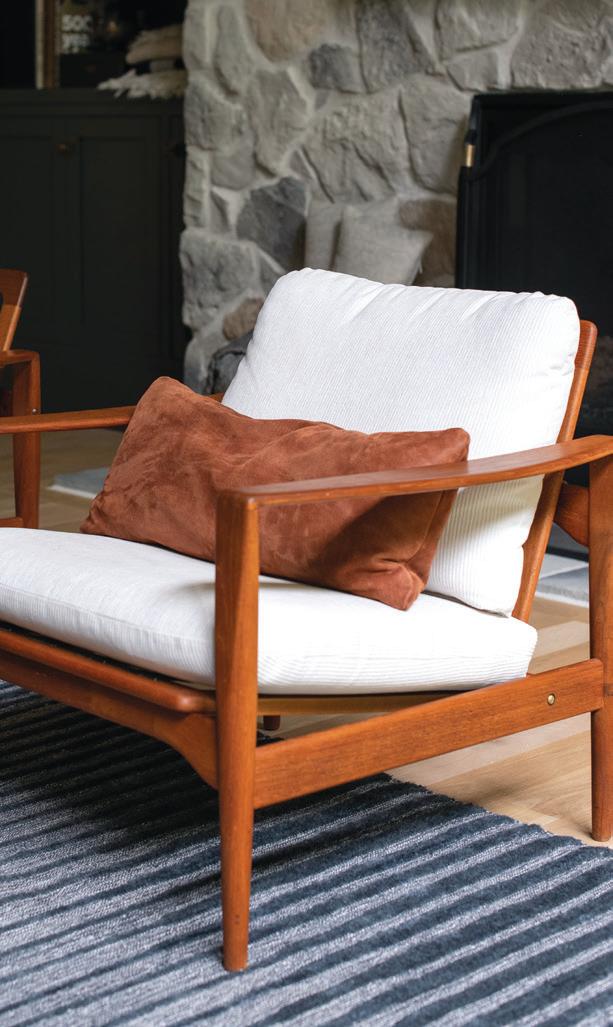 fireplace. “It is so comfortable, and the wood on it is so beautiful,” she raves. “The curve on the arm just is so ergonomic. They don’t make furniture like that anymore.”