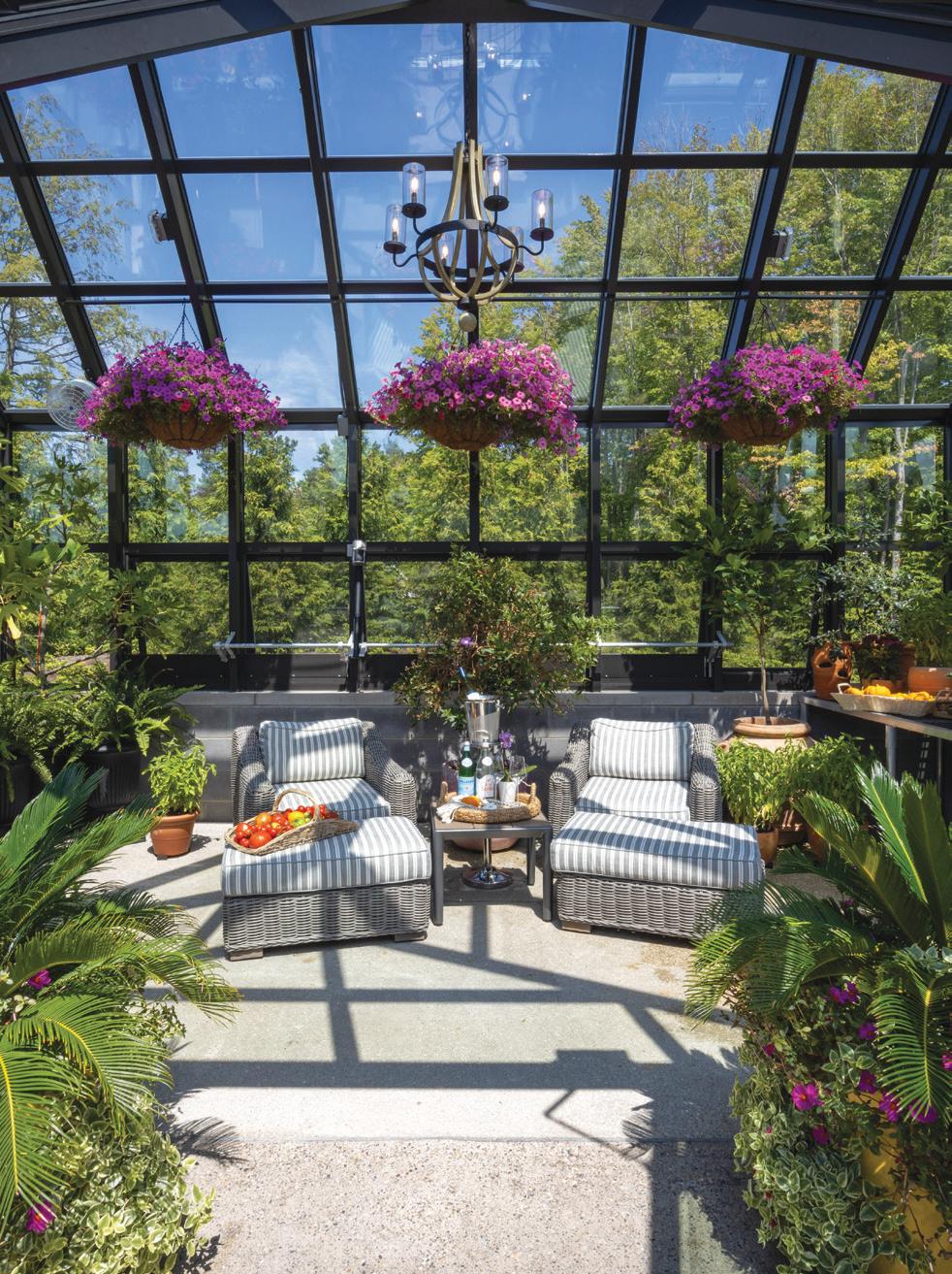 The greenhouse already functions as a living space. The homeowners like to sit in all-weather gray-wicker armchairs under an indoor-outdoor woodand-metal chandelier and enjoy a glass of wine in the evening. They breakfasted there the day we visited.