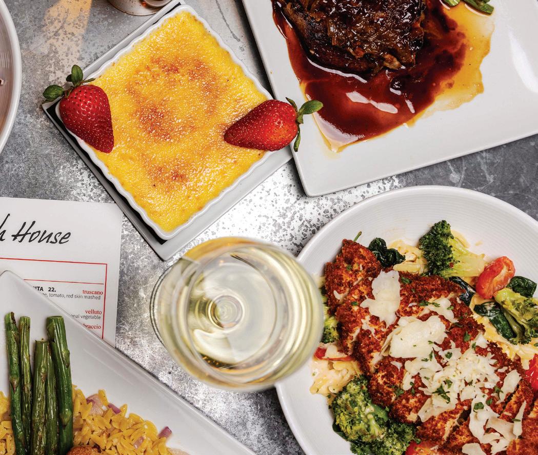 designed to complement the wines. Don’t miss a photo op under the striking red wine bottle chandelier. In warmer months, both The Crush House and The Piazza welcome visitors to dine al fresco, the latter boasting lake views. Should your travels take you off site, explore the nearby OLINDA (ideal for brunch or a casual dinner) and The Twisted Olive (a rustic-chic venue in a park-like setting with fresh takes on Italian American classics).