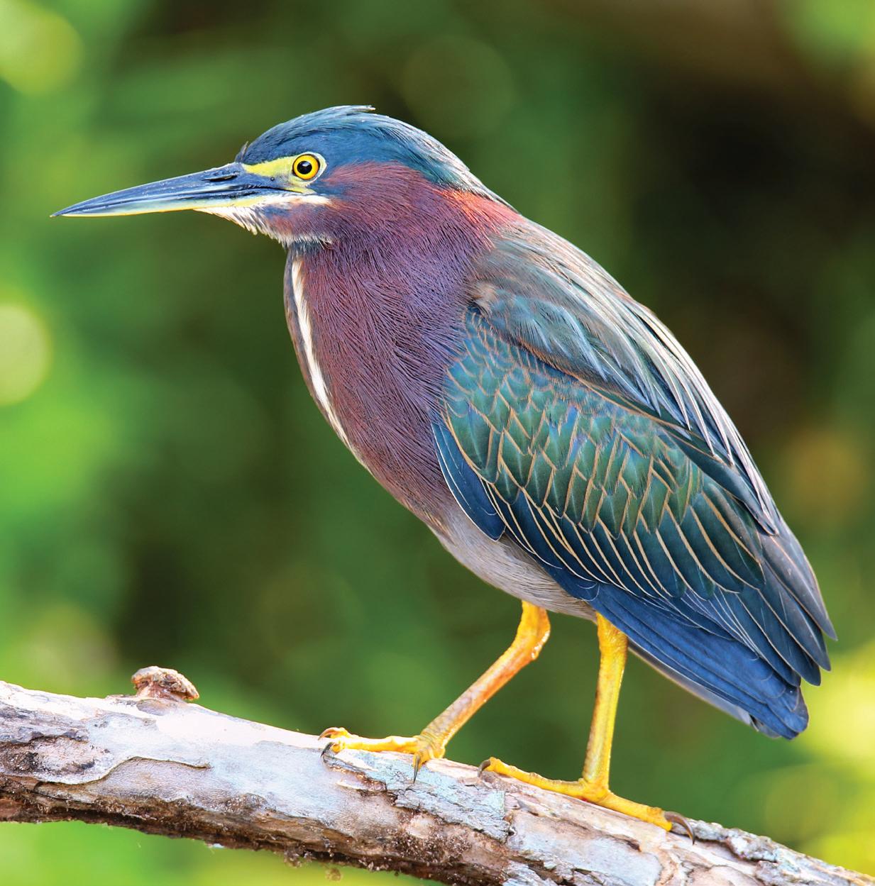 Equipped with sharp beaks and keen eyesight, green herons are skilled hunters who prey on various aquatic creatures. Their diet consists primarily of small fish, frogs, insects, crustaceans and occasionally small mammals. With a patient approach, green herons stalk their prey from the shallow waters or perch on low overhanging branches, striking with lightning speed to secure their next meal. They frequently craft fishing lures using bread crusts, insects and feathers, strategically dropping onto the water's surface to attract small fish.