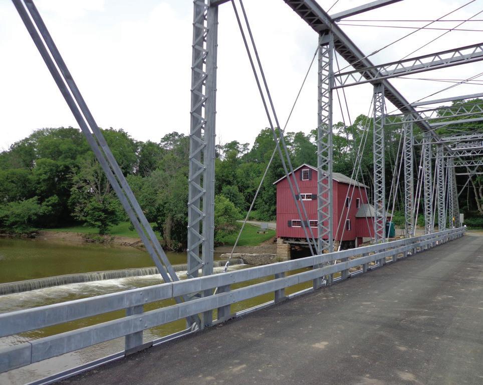 The Indian Mill Bridge, a historic 1913 pin-connected Pratt through truss built by The Modern Construction Company, is in Wyandot County where County Route 47 crosses the scenic Sandusky River. Recognized with a 2015 Ohio Historic Bridge Award from the Federal Highway Administration, ODOT, and the State Historic Preservation Office, the bridge underwent an innovative rehabilitation that preserved its late-19th-century ornate features while modernizing its structure with a galvanized coating. This award-winning landmark is situated adjacent to the National Register-listed Indian Mill, providing visitors with a vivid, immersive 19th-century setting that combines industrial history with natural beauty. Your
