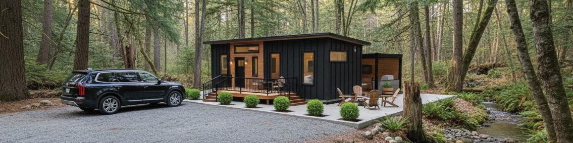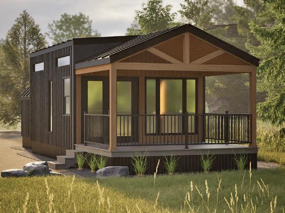 A stunning new cabin model is the centerpiece of the display. Featuring a sophisticated transitional style, this cozy, inviting cabin seamlessly combines contemporary elements with classic charm.