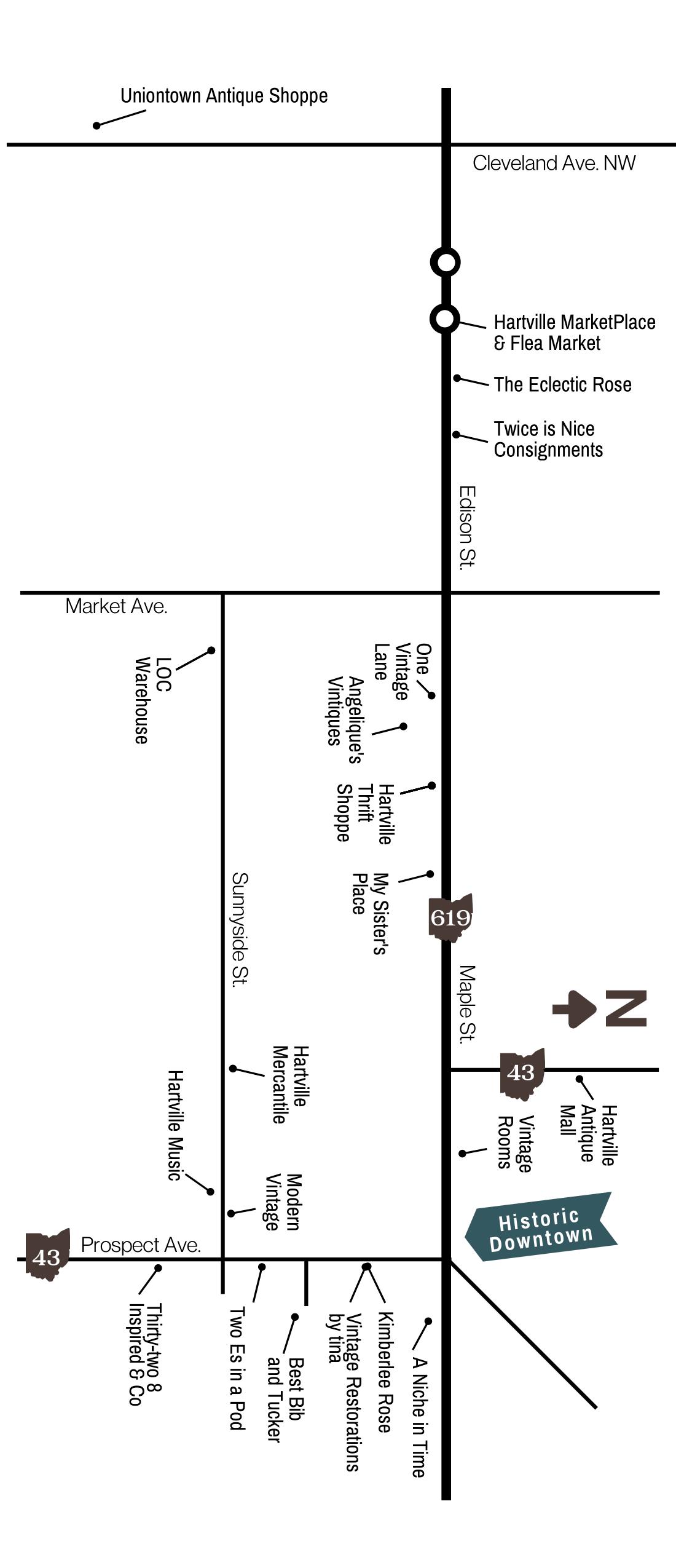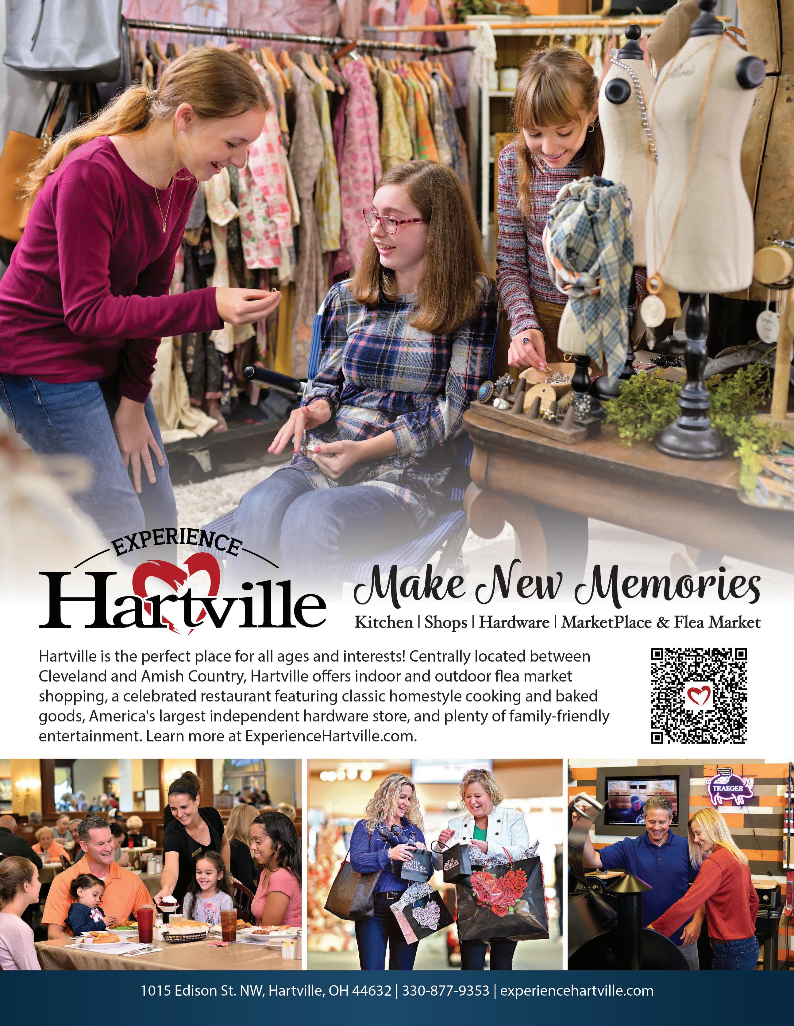 A division of the Lake Township Chamber of Commerce. Make your next stop Hartville, Ohio! Scour America’s largest flea market and explore more than a dozen antique, thrift, and resale shops for those one-of-a-kind finds! Come for a day or stay for two! You’ll find a warm welcome every time! 12801 Cleveland Ave., Uniontown 330-699-6235 @UniontownAntiqueMall Download our map and guide, check out our website, and follow us on Facebook and Instagram @discoverhartville discoverhartville.com • Lowest thrift prices • Huge selection of merchandise • Supports Mennonite Central Committee @HartvilleThriftShoppe • 938 West Maple St. HARTVILLE THRIFT SHOPPE Modern Vintage Furniture • Home Decor • Antiques @trwmodernvintage 1122 W. Maple St 330-587-4061 Angeliques-Vintiques.business.site @angeliquesvintiquesllc Historic Downtown Hartville A Niche in Time 230 E Maple St. @nicheintime You’ll find over a dozen shops within two miles of Hartville Mercantile 649 Sunnyside St. @hartvillemercantile Kimberlee Rose Antiques & Vintage 110 S. Prospect Ave. @ShopKimberleeRoseAntiques