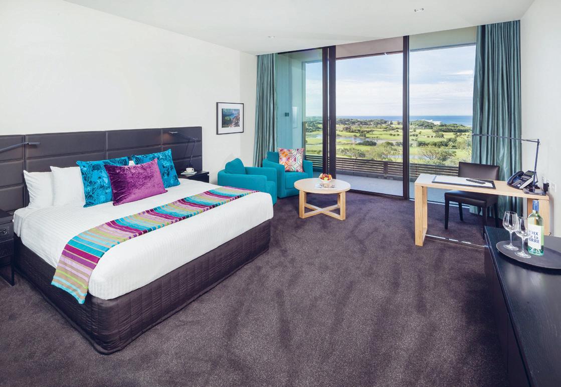 Floor-to-ceiling windows afford grand vistas across the 18-hole championship golf course to the rolling dunes and Victoria’s famous Surf Coast on the Great Ocean Road. 112 recently rejuvenated and refurbished rooms and suites offer urban and golf course views. Each room features a private balcony or terrace.