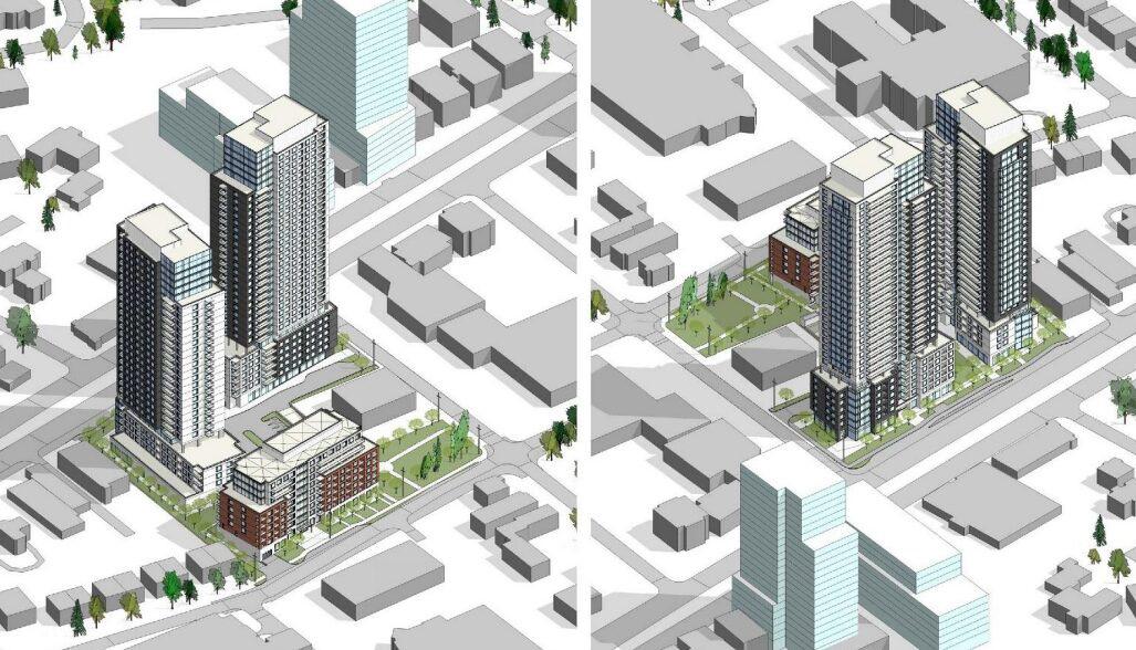According to the application summary for the project, the 34-storey tower would be devoted to residential units, while the other two highrises would include residential units plus a five-storey podium with more than 140,000 square feet of office space and 21,000 square feet of retail space along Gladstone Avenue.