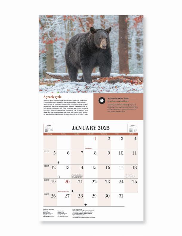 Our 2025 wall calendar, A Year of Bear s, showcases amazing images by nature photographer and black bear advocate Bill Lea. Each month features BearWise® Basics— tips for living and recreating responsibly in bear country—as well as seasonal flora and fauna information, like wildflowers in bloom and predicted peak leaf color dates.