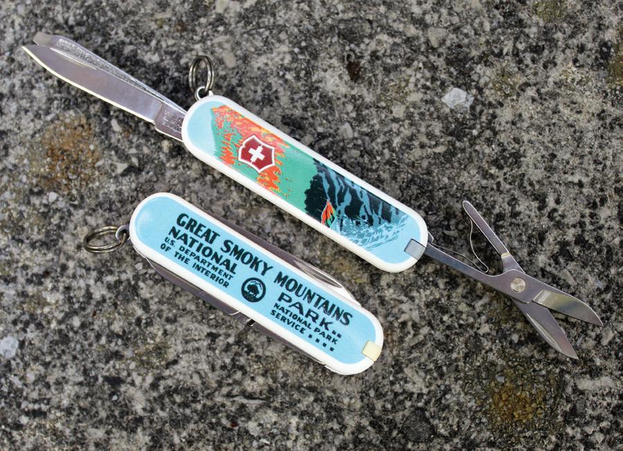 Take home this unique Victorinox Swiss Army knife with a beautiful mountain scene on one side and the words Great Smoky Mountains National Park on the other. Tools include: blade, nail file, screwdriver, scissors, key ring, tweezers, and toothpick.