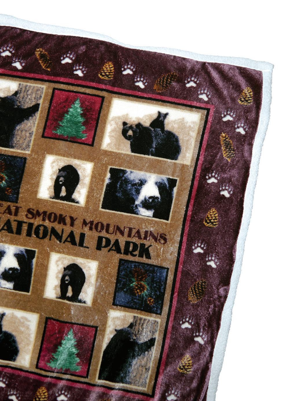 new super-soft fleece blanket features six black bear images surrounding the name of the park together with evergreens and pine cones on a background of royal plum. The reverse is a luxurious white sherpa fleece.