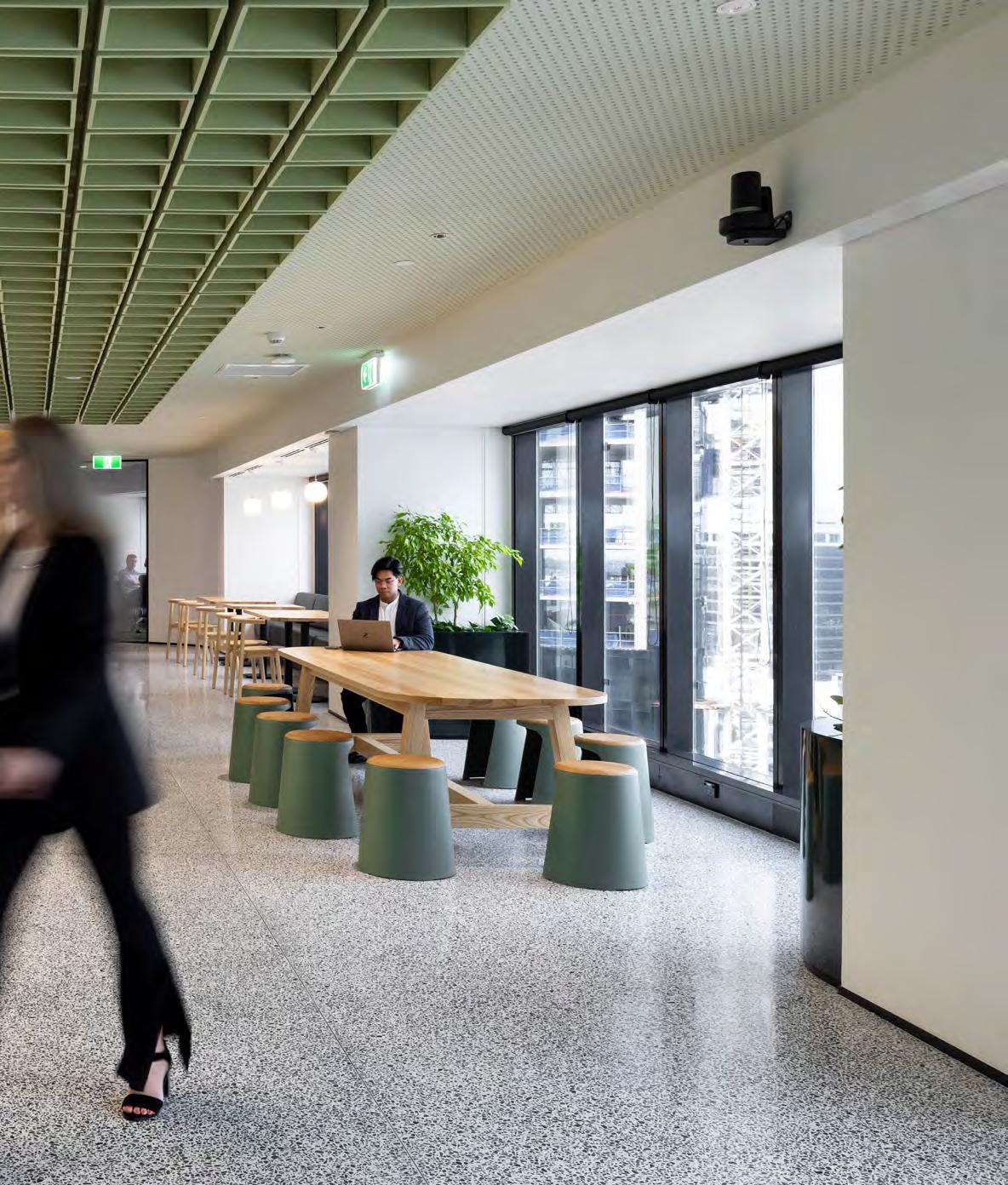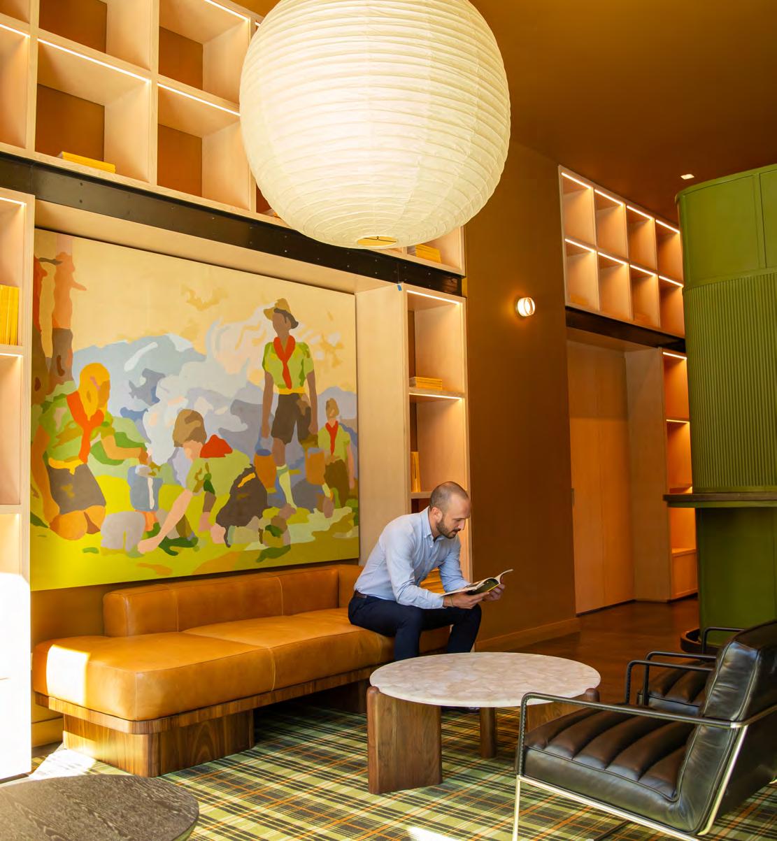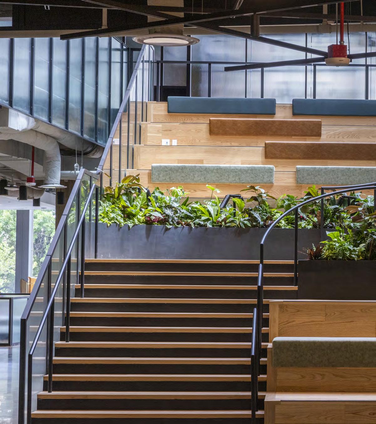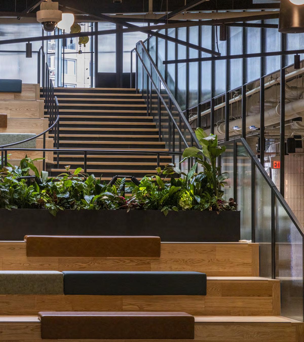 An open-plan and light-filled communal hub for staff, it houses a café, a 200-person event venue, breakout areas, meeting rooms, and even a roof-deck dog run and basketball courts. It’s a place to meet, mingle, and collaborate, and a home for chance interactions and internal community building. Read more about the project at gbdmagazine.com.