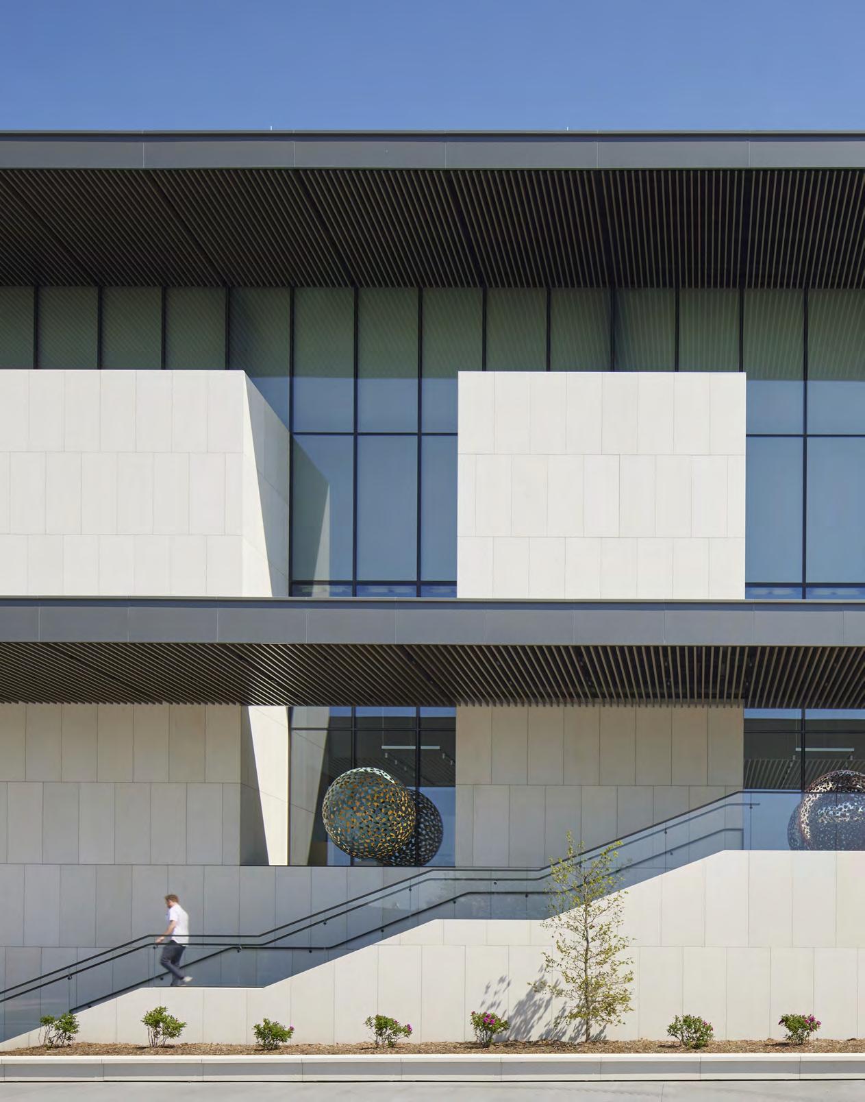NeXclad is offered in 14- and 16-inch versions, as well as NeXclad True, which can be installed flush for a sleek look. Like Ludowici’s terra-cotta roofing products, NeXclad is available in a variety of colors and surface textures, as well as carries a 75-year warranty. “Because it’s small format and we can customize the color and texture, designers can transition and blend it with a lot of other materials, like wood, brick, and stone,” Harris says.
