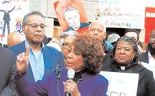 California Congresswoman Maxine Waters speaks at a CFPB rally Also attending are Representatives Emanuel Cleaver (D-Mo ) and Joyce Beatty (D-Ohio)