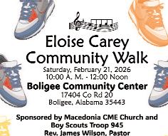 MACEDONIA CHRISTIAN METHODIST EPISCOPAL CHURCH OF BOLIGEE, AL WILL BE HAVING ITS ANNUAL BLACK HISTORY PROGRAM ON SUNDAY, FEBRUARY 15, 2026 AT 2 P M MR DANNY STEELE, OWNER OF VAN HOOSE AND STEELE FUNERAL IN TUSCALOOSA, AL AND A MEMBER OF BAILEY TABERNACLE CHRISTIAN METHODIST EPISCOPAL CHURCH OF TUSCALOOSA, AL IS THE GUEST SPEAKER BAILEY C M E MALE CHORUS IS THE GUEST CHOIR WE WOULD GREATLY APPRECIATE YOUR PRESENCE AS WE CELEBRATE “A CENTURY OF BLACK HISTORY COMMEMORATIONS,” HONORING THE 100TH ANNIVERSARY OF THE CELEBRATION FOUNDED BY DR CARTER G WOODSON IN 1926 DINNER WILL BE SERVED REV JAMES WILSON, PASTOR