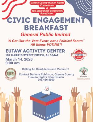 Rev. Joe Webb, Pastor Join us and Meet and Greet West Alabama Civil Rights and Political Leaders Everyone is welcome and urged to attend Sponsored by Councilmen Lorenzo French and Greene County Elected Officials Eutaw, Alabama 35463