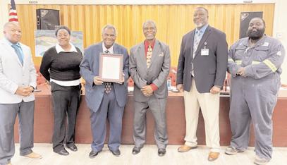 Greene County School Board presents plaque to Legal Counsel, Hank Sanders, in honor of 2,000 weekly Sketches columns L to R: Board members: Davis, Dancy, Hank Sanders, holding award, Chair Leo Branch, Superintendent Timothy Thurman and Merriweather