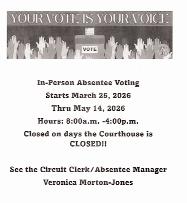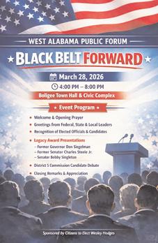 State of Alabama County of Greene Public Notices of the requirement for and the avaialbe of Registration and Voting Aids for all handicapped and elderly indiviudals for the Democratic and Republican Primary and Constitutional Amendment election held on May 19, 2026 Pursuant to 5214-239 b), of the code of Alabama (1975) notice is hereby given of the following with regards to Greene County, Alabama; The Probate Judge as Chief Election Official makes it known in each voting district that, as required Greene County Alabama is in compliance with the availability of registration and voting aids for all handicapped and elderly individuals as stated in Code of Alabama Section 21-4-23(b)