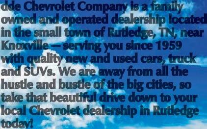 ddeChevroletCompany is afamily ownedandoperateddealershiplocated in thesmall townofRutledge,TN, near Knoxville —ser ving yousince1959 with qualit ynew andused cars,truck l andSUVs .Weare away fromall the hustleandbustleof thebig cities,so take that beautifuldrive down toyour localChevroletdealershipin Rutledge today!