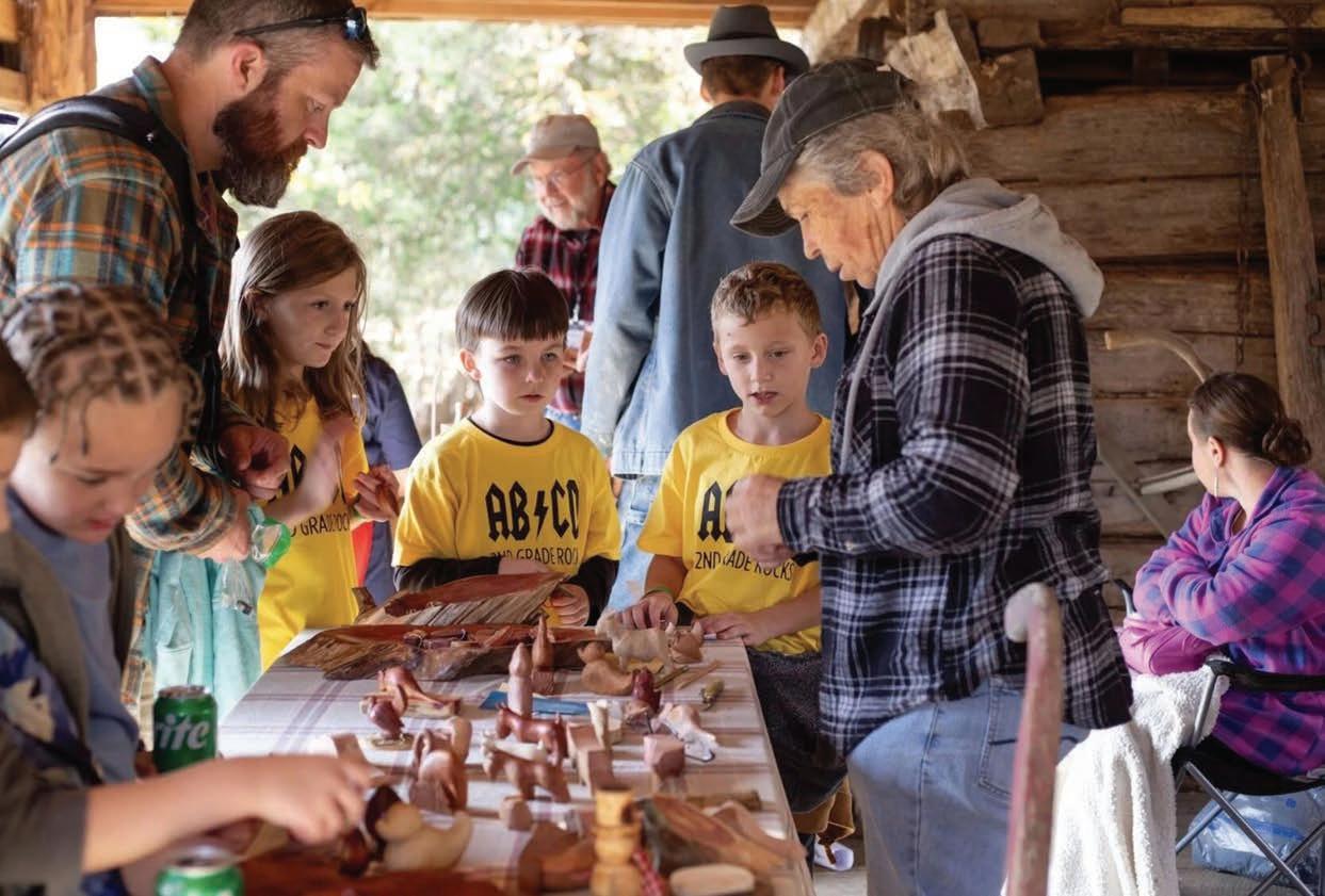 Renee Stewart demonstrating wood carving to children at a Festival at The Museum of Appalachia.