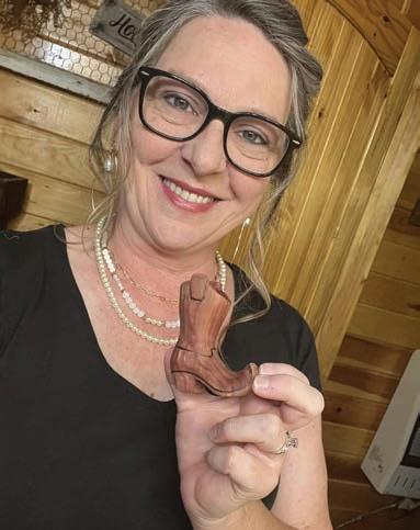 Christi Fleenor with a carving she created in the form of a boot.
