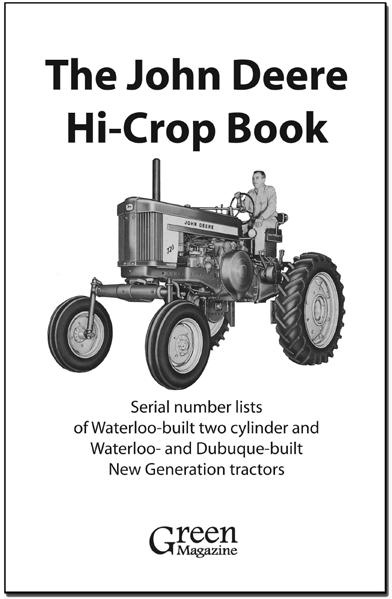 The John Deere Hi-Crop Book This book provides serial number lists for JD models A, G, 60, 70, 620, 720, 430, 630, 730, 2010, 2510, 4010, 2520, 3020 and 4020. Verify Hi-Crop serial numbers, build dates and shipping locations in a pocket-sized book that’s easy to carry anywhere. Production summaries of two cylinder Hi-Crop tractors provided, as well as Hi-Crop totals by state and more. 72 pages, 5.5 x 8.5,” paperback, limited quantity. Order GMHC - $19.95 US, $26.95 C/F