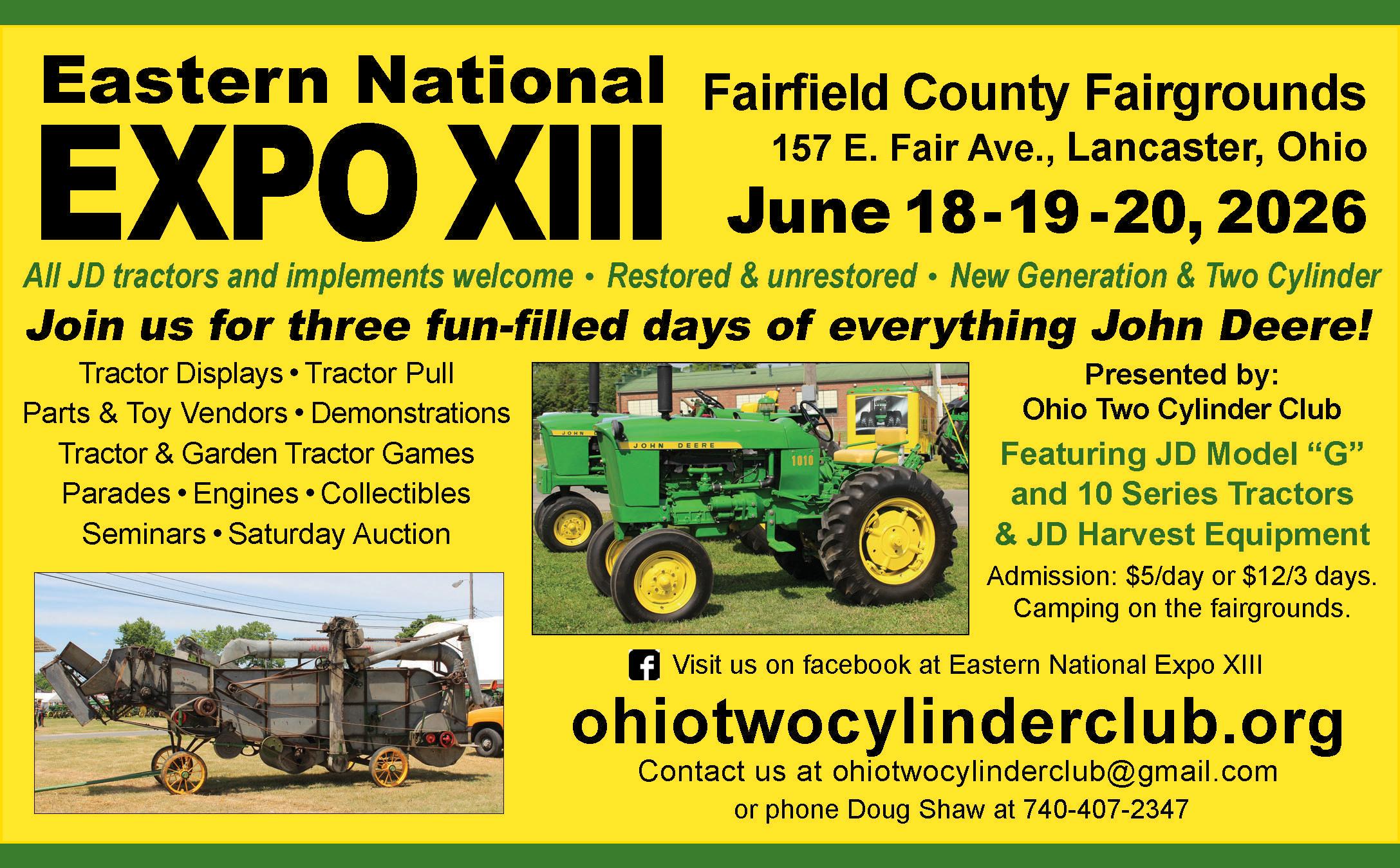 Announcing: Eastern National Expo XIII. Fairfield County Fairgrounds, Lancaster, Ohio. June 18-20, 2026. See website: OhioTwoCylinderclub.org for details.