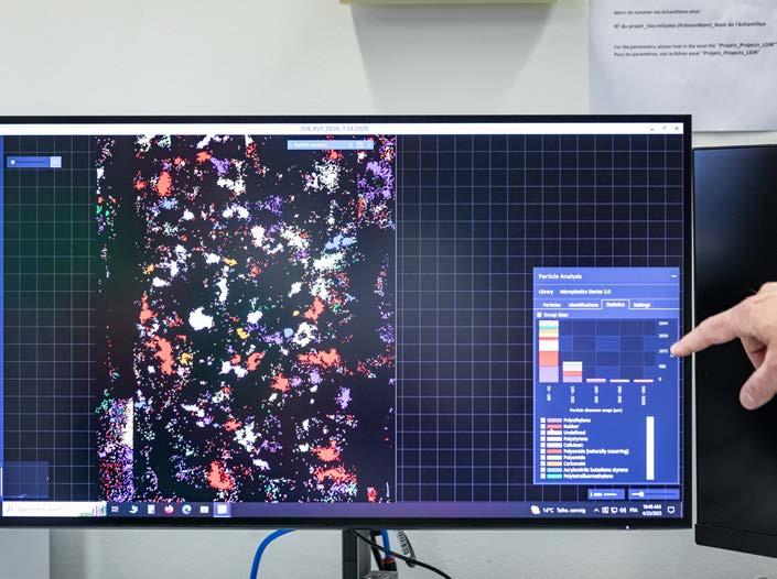 La poudre qui en résulte est ensuite disposée sur un support et insérée dans un appareil d’imagerie spectroscopique qui, sur la base d’un signal infrarouge, détermine différentes propriétés de la particule, comme sa forme et la masse, ainsi que sa composition chimique, soit le type de plastique en présence. Un échantillon « blanc », soit un support vide, a aussi été soumis à cette analyse, ceci afin d’estimer la quantité de microplastique présente sur le support, indépendamment des étapes précédentes.