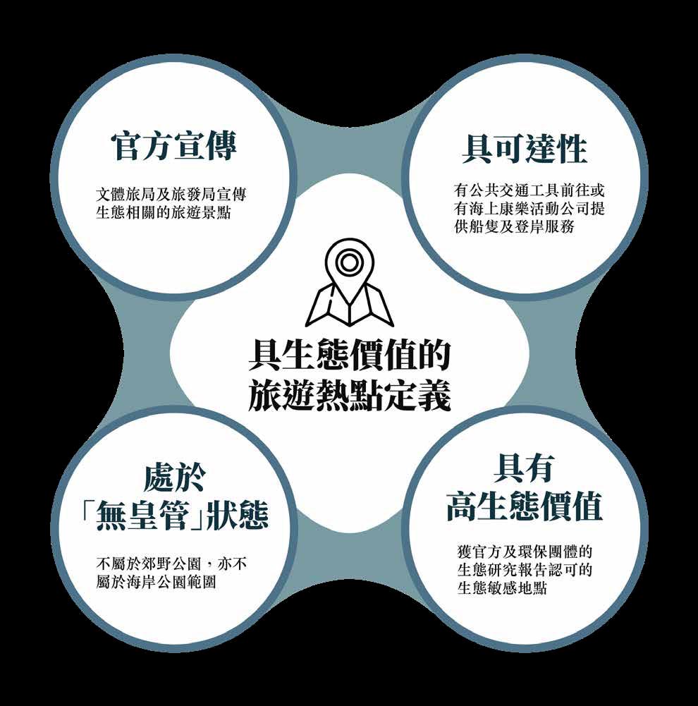 本研究系統性地識別獲官方作旅遊廣泛宣 傳、不屬於法定保護區,並且 於生態敏 感地區的潛在旅遊熱點時,須確保其符合以下四個條 件。
