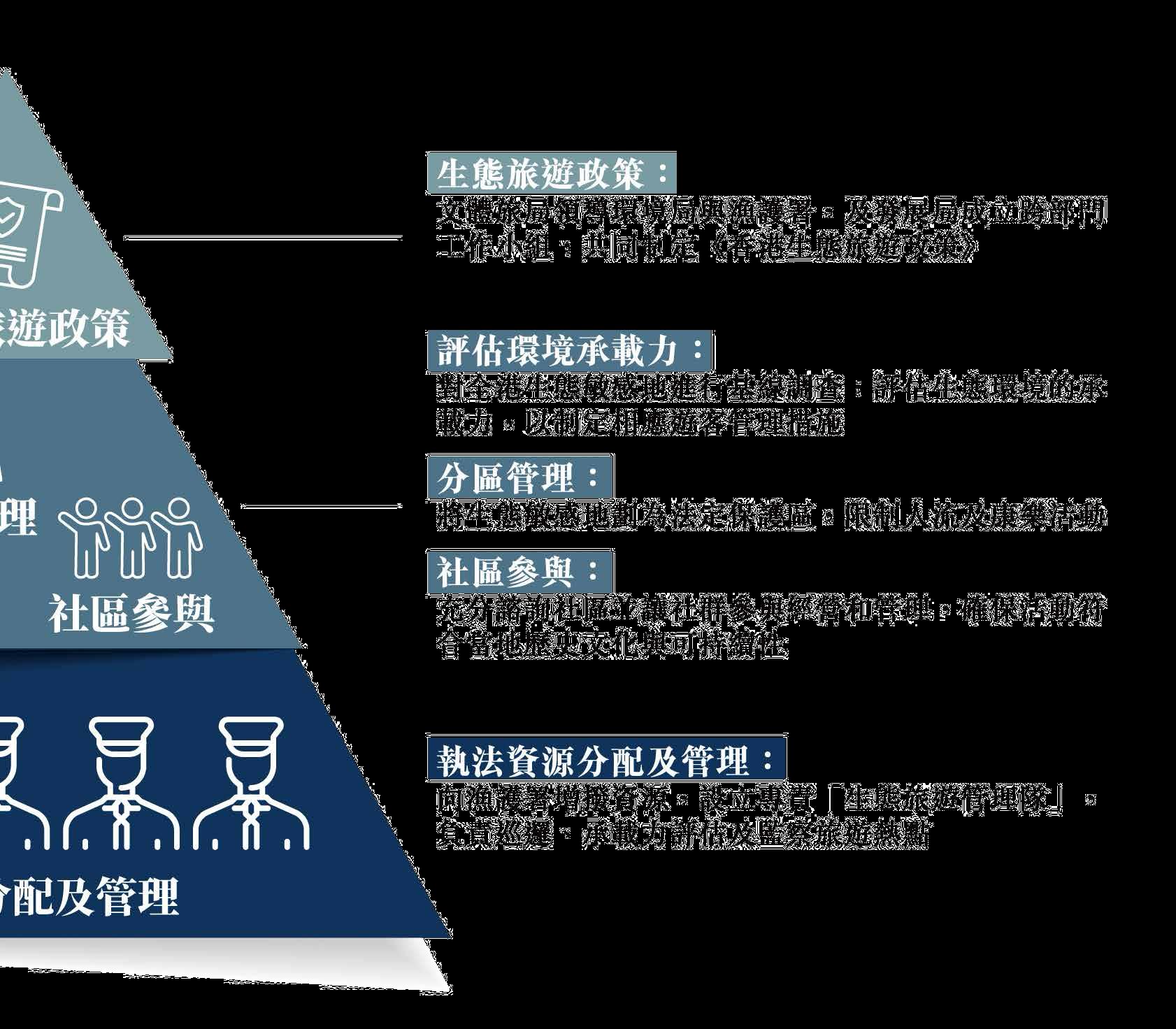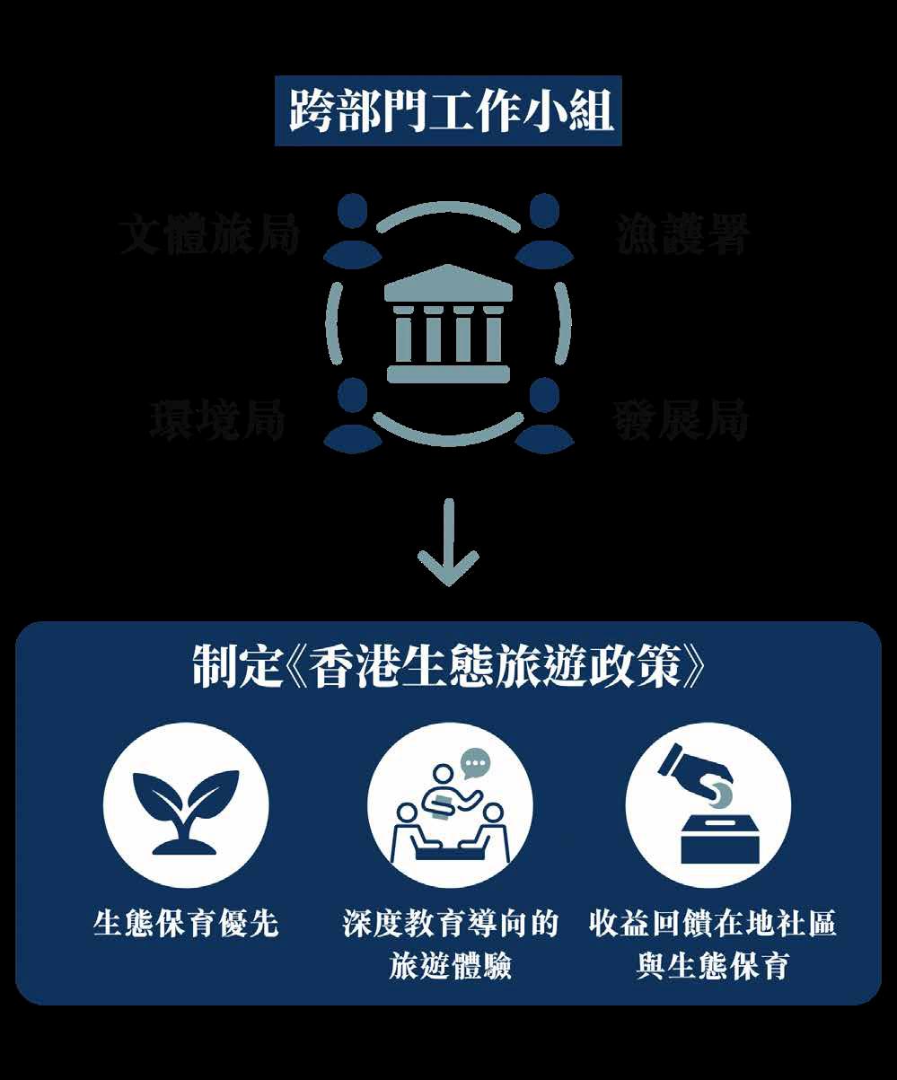 1. 文體旅局須主導制定香港生態旅遊政策: 成立跨部門 工作小組(文體旅局牽頭,環境局、漁護署、發展局 參與),明確定義生態旅遊,並確立「生態保育優先」、 「深度教育導向」及「收益回饋社區與保育」三大原則, 取代現時以基建及大眾旅遊為主導的模式。