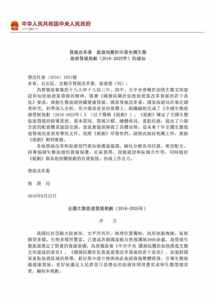 [32] 「把保護放在生態旅遊發展的首 」,關於印發全國生態旅遊發展規劃(2016-2025年)的通知,發展改革委及 國家旅遊局,2016 http://big5.www.gov.cn/gate/big5/www.gov.cn/gongbao/ content/2017/content_5194900.htm