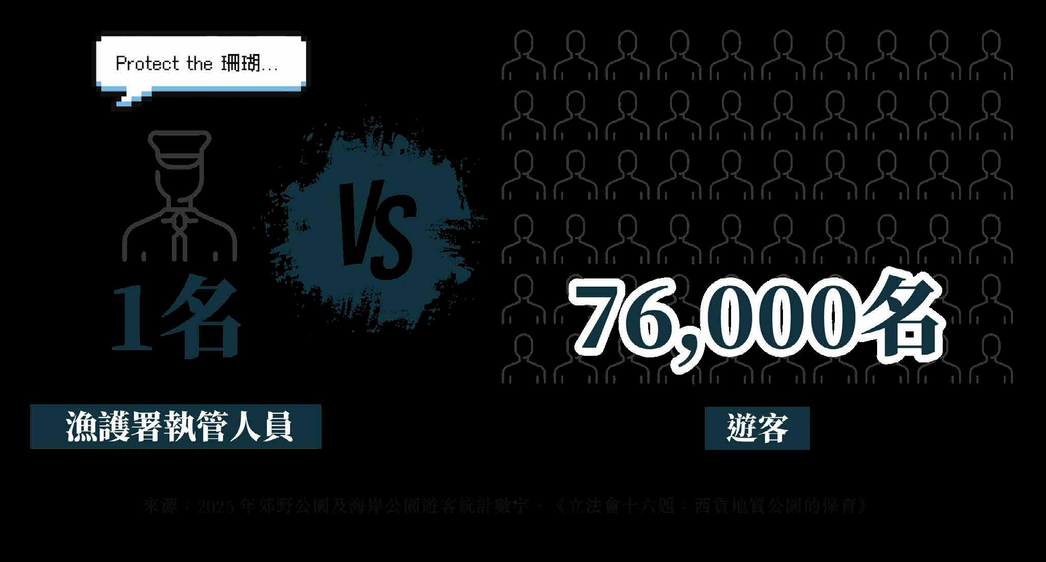 3. 漁護署人手與權限不足,執法形同虛設:全港僅約 150 名職員巡邏郊野公園(平均 1 人應對 7.6 萬名遊客), 77 人管理 8,514 公頃海岸公園;2025 - 26年度相關人 手更淨減少 7 人。亂拋垃圾定額罰款比率僅 0.05%0.06%。橋咀亂象揭示漁護署在郊野公園以外的區域, 只能口頭勸喻;郊野公園「不包括土地」及大部分珊 瑚區同屬執法盲點,加上部門間執管權責不清,無法 制止破壞。