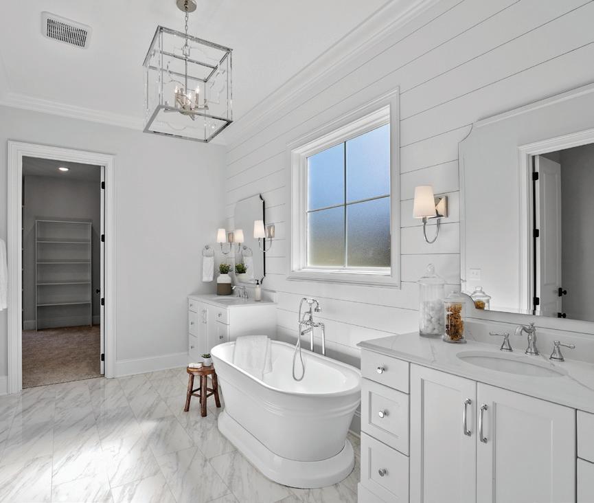 Large showers and standalone or additional soaking tubs are making a splash in today’s bathrooms, especially where larger square footage allows for them. Great bathroom designs also focus on the ability to bring in lots of natural light while still maintaining privacy, whether through frosted panes or outdoor privacy walls.