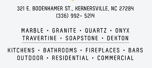 Amanzi Marble & Granite is a trusted name in quality residential and commercial countertops and stone accents. Centrally located in Kernersville, NC our 40,000 sq ft indoor showroom has one of the best selections of natural and manmade material in the Carolinas. Our professional in-house teams all work together, from start to finish, to provide our customers and contractors with the ultimate in customer service and satisfaction. No job is too small or too large for Amanzi Marble & Granite. Creating Beauty That Lasts A Lifetime T-336.993.9998 F-336.993.9988 WWW.AMANZIGRANITE.COM COMPLIMENTARY IN-HOME ESTIMATES AT AMANZIGRANITE.COM INFO@AMANZIGRANITE.COM 703 PARK LAWN COURT, KERNERSVILLE, NC 27284 GRANITE MARBLE QUARTZ ONYX QUARTZITE PORCELAIN DEKTON
