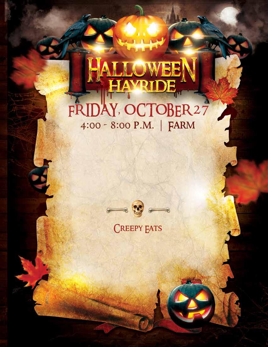 Put on your best costume and come to the Halloween Hayride, everyone’s favorite event of the fall! There will be a face painter, amusement rides and inflatables, music by DJ Johnnie, a spooky boo-fet and of course, both scary and traditional hayrides!