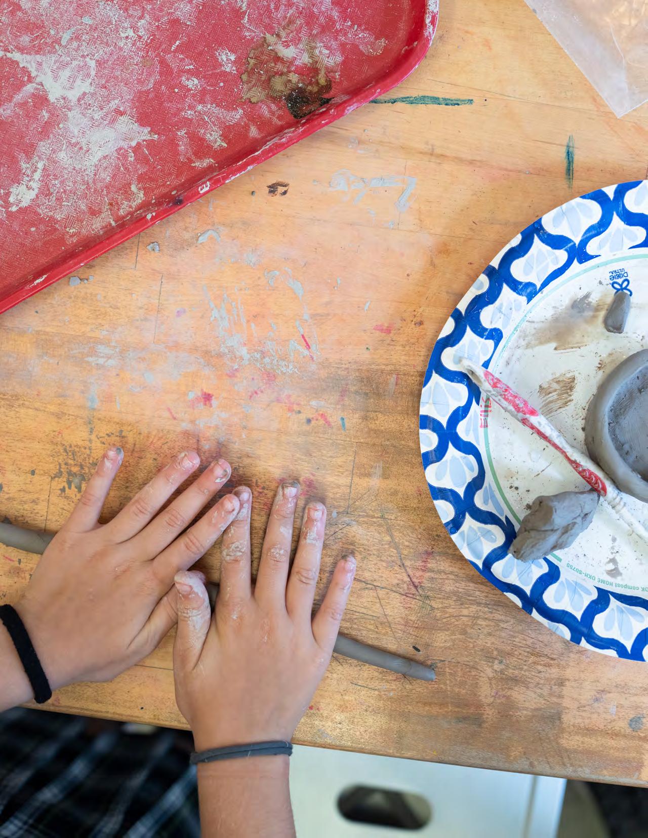 Students work with greater independence, applying previous skills to more complex, multi-step projects. They expand their understanding of color theory, design, and self-expression through sketchbook studies, critiques, and advanced work in drawing, painting, printmaking, and sculpture.