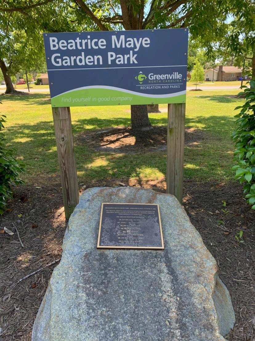 This park is located on Farmville Blvd. and is a beautiful setting donated in honor of Mrs. Beatrice Maye for all of her support and dedication to the citizens of Greenville. 1100 Farmville Blvd. Greenville, NC 27834